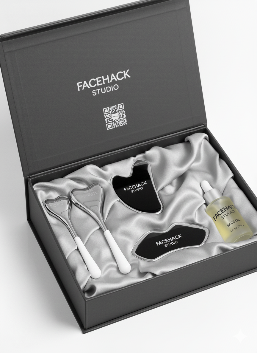 Gua Sha má kořeny v tradiční čínské medicíně, kde se praktikuje už tisíce let. Techniky se zdokonalovaly po staletí, aby pomáhaly nejen s fyzickými neduhy, ale i s krásou. V FACEHACK STUDIO to bereme jako inženýrství krásy – přirozený způsob, jak zpomalit stárnutí bez injekcí. Naše verze? Minimalistická: amethysový nebo jadeitový nástroj, který firmuje a liftuje pleť, ideálně s naším olejem pro hladký skluz.